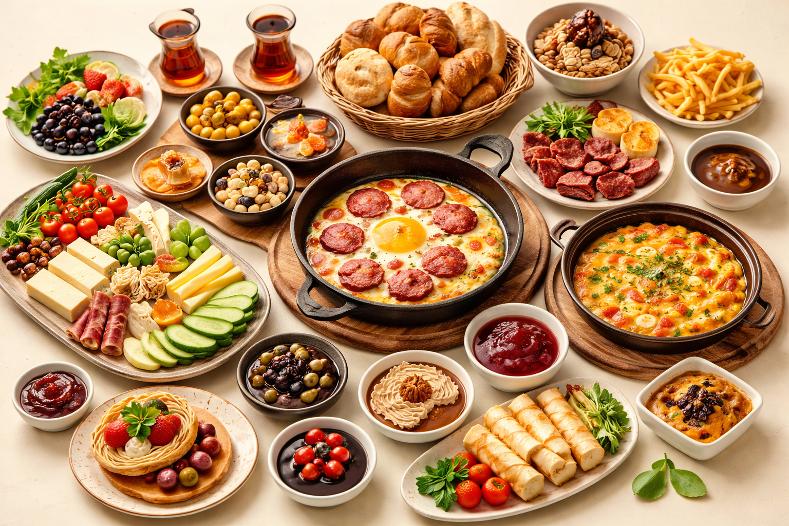 Haşlanmış Yumurta Domates Salatalık Siyah Zeytin Yeşil Zeytin Sigara Böreği Vişne Reçeli Bal Tereyağ Nutella